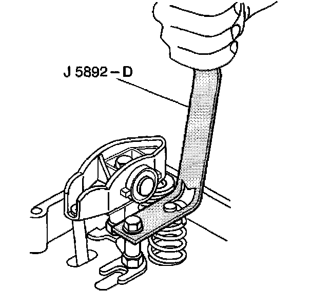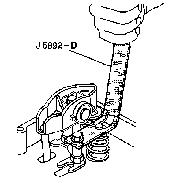 5. Compress the valve spring with J 5892-D and remove the valve locks and cap.