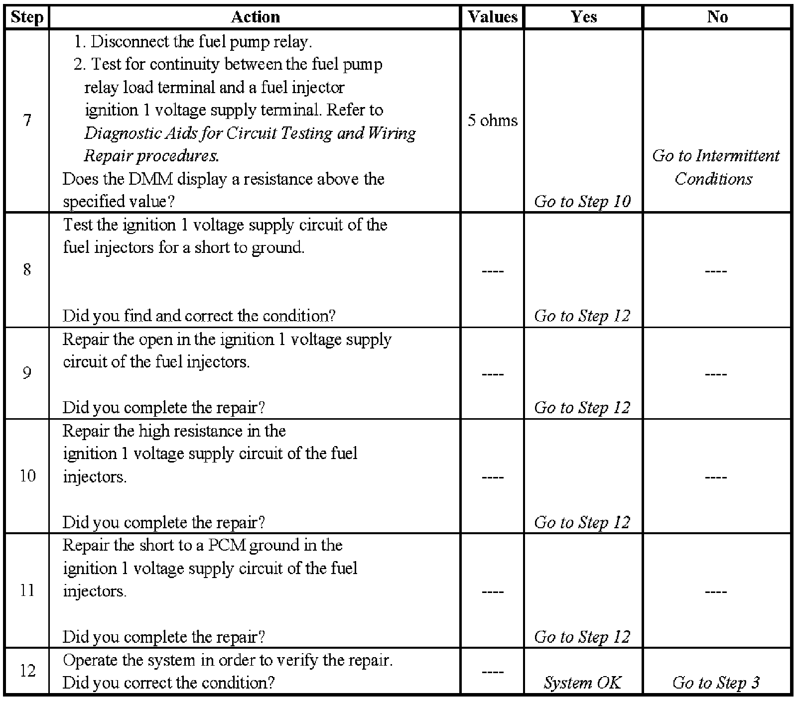 6. This step tests for an open ignition 1 voltage supply circuit between the fuel pump relay and the fuel injectors.