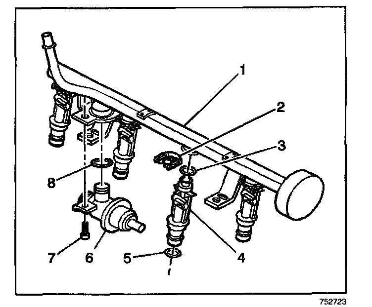 IMPORTANT: Inspect the fuel injector in order to determine if the upper O-rings was also removed. If the upper O-rings is not removed, remove the O-rings from the fuel rail assembly.
