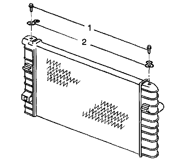 5. Remove the radiator upper mounting bolts (1) and the upper radiator mounts (2).