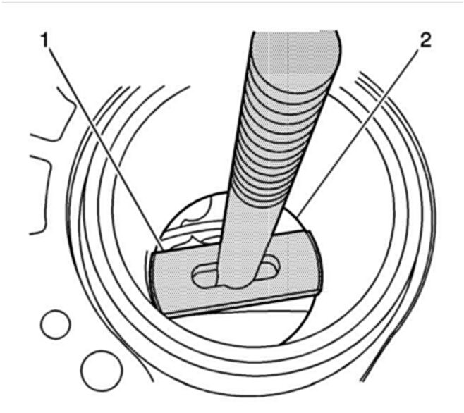7. Align the shoe (1) of the EN 45680-852 cylinder bore sleeve puller to the bottom of the cylinder bore sleeve (2).