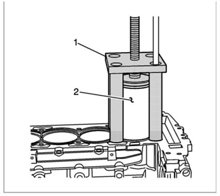 5. Align the installation arbor (1) onto the top of the cylinder bore sleeve (2).