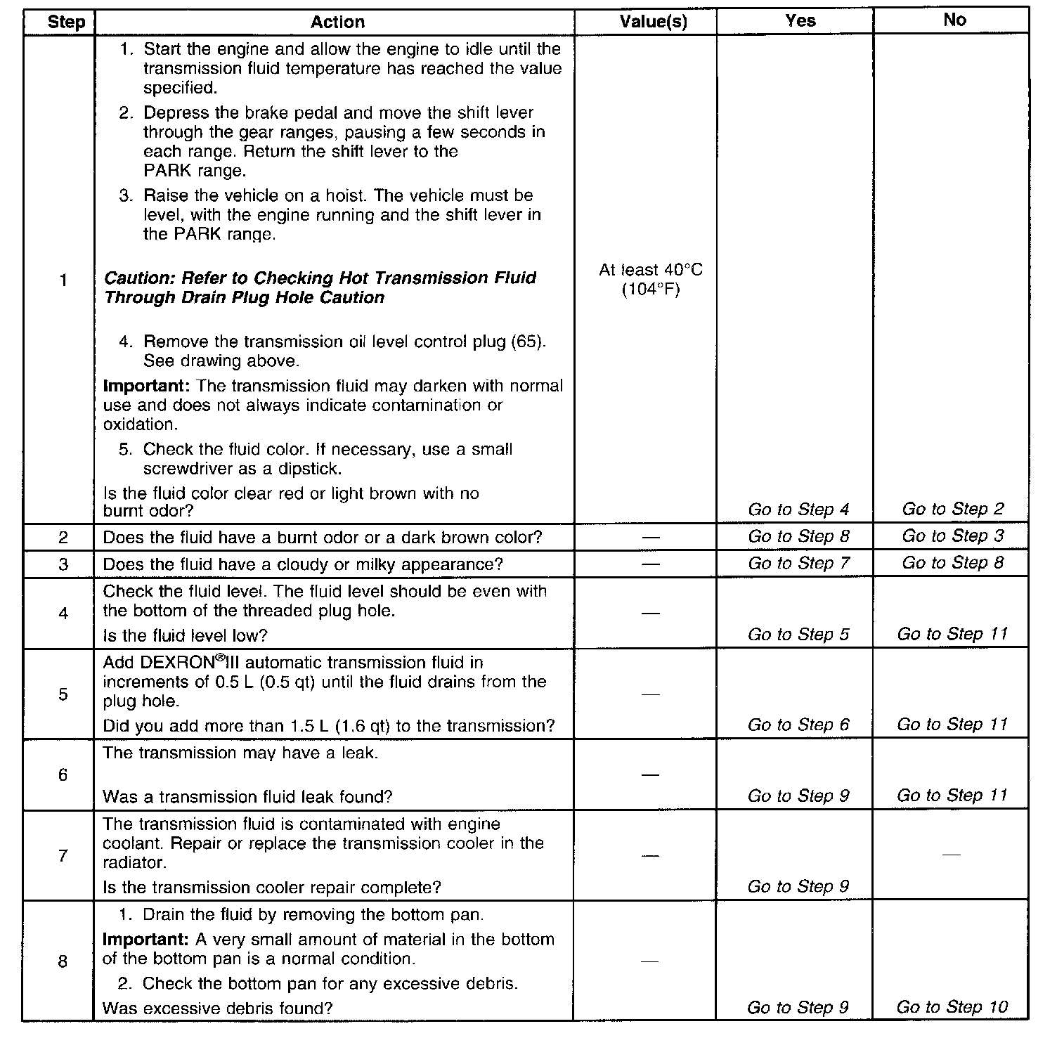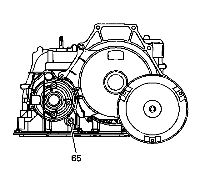 The oil level control plug (65) is located on the torque converter side of the transmission.