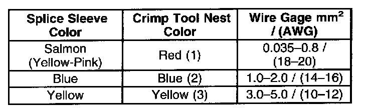 4. Select the proper sealed splice sleeve according to the wire size. Refer to the table at the beginning of the repair procedure for the color coding of the splice sleeves and the crimp tool nests.
