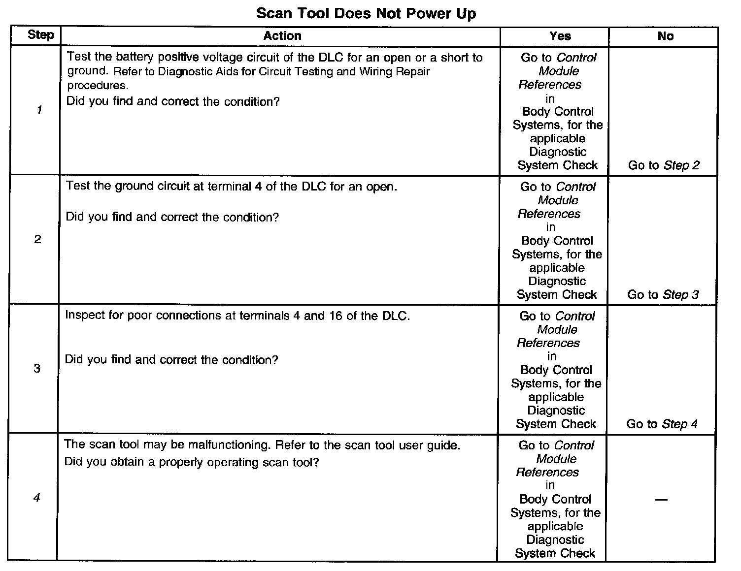 CIRCUIT DESCRIPTIONThe data link connector (DLC) provides operating power for the scan tool at terminal 16 (battery positive voltage) and at terminal 4 (ground). The DLC provides the class 2 serial data signal at terminal 2 and signal ground at terminal 5. The scan tool will power up with the ignition off. Many modules however, will not communicate unless the ignition is on.