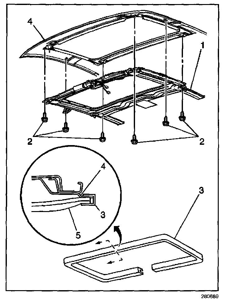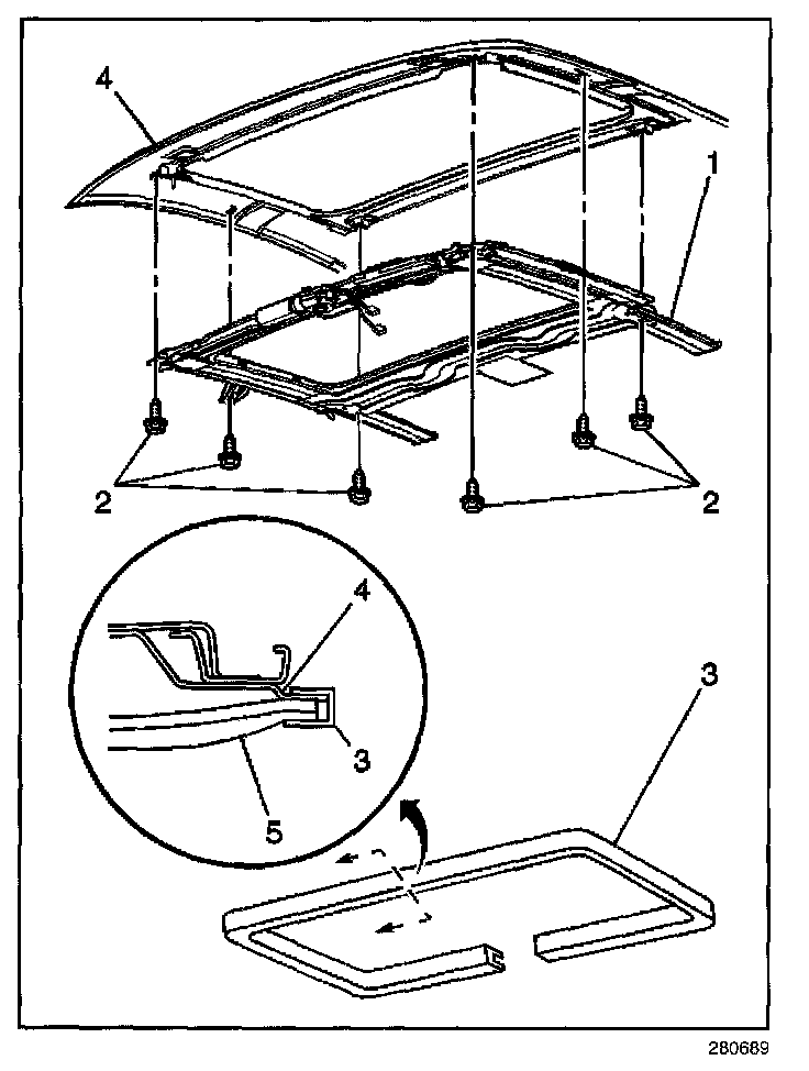 5. Remove the sunroof module (1), by pulling the module downward at the rear mounting points to disengage the white locating pins with an assistant.