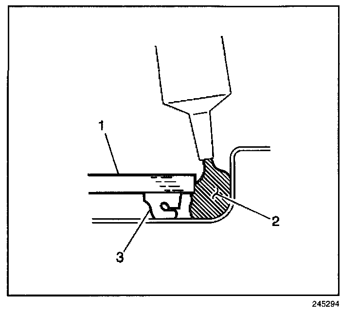 6. Apply a small bead of urethane adhesive (2) between the window (1) and the pinch-weld.