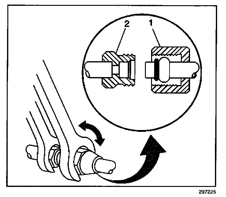 11. Using a back-up wrench on the condenser fitting (2), secure the compressor hose fitting (1) to the condenser.