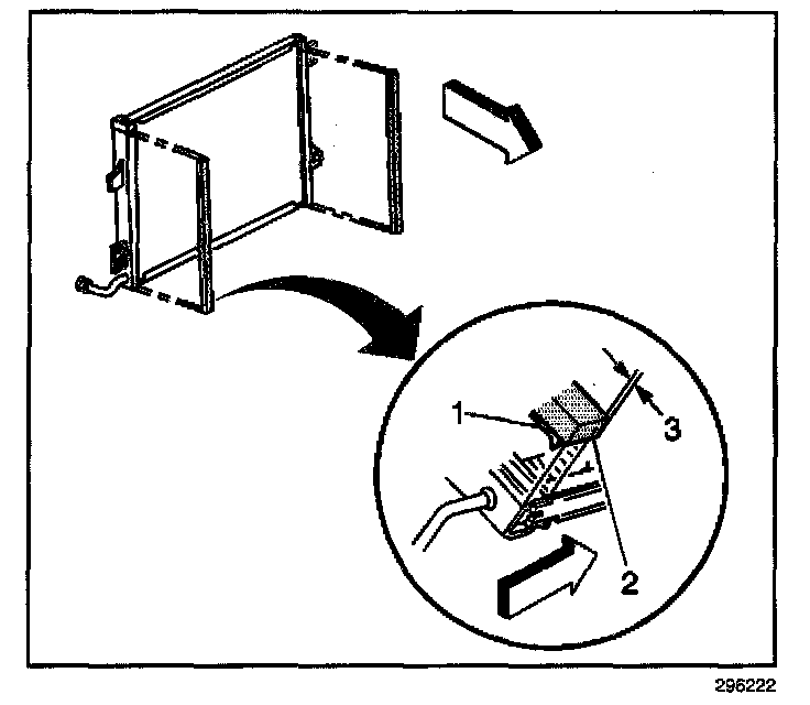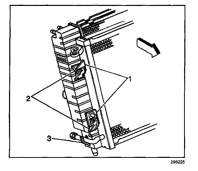 12. Raise the condenser along the radiator to release the condenser tabs (1) from the radiator slots (2).