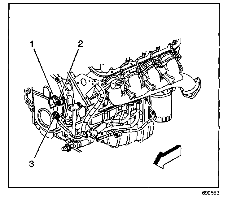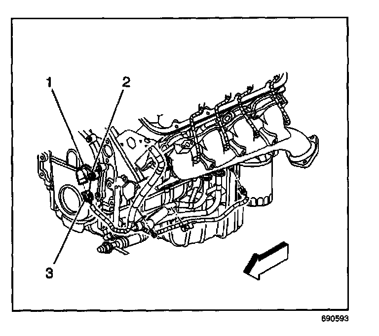 2. Disconnect the camshaft position (CMP) sensor harness connector (3) at the CMP sensor (1).
