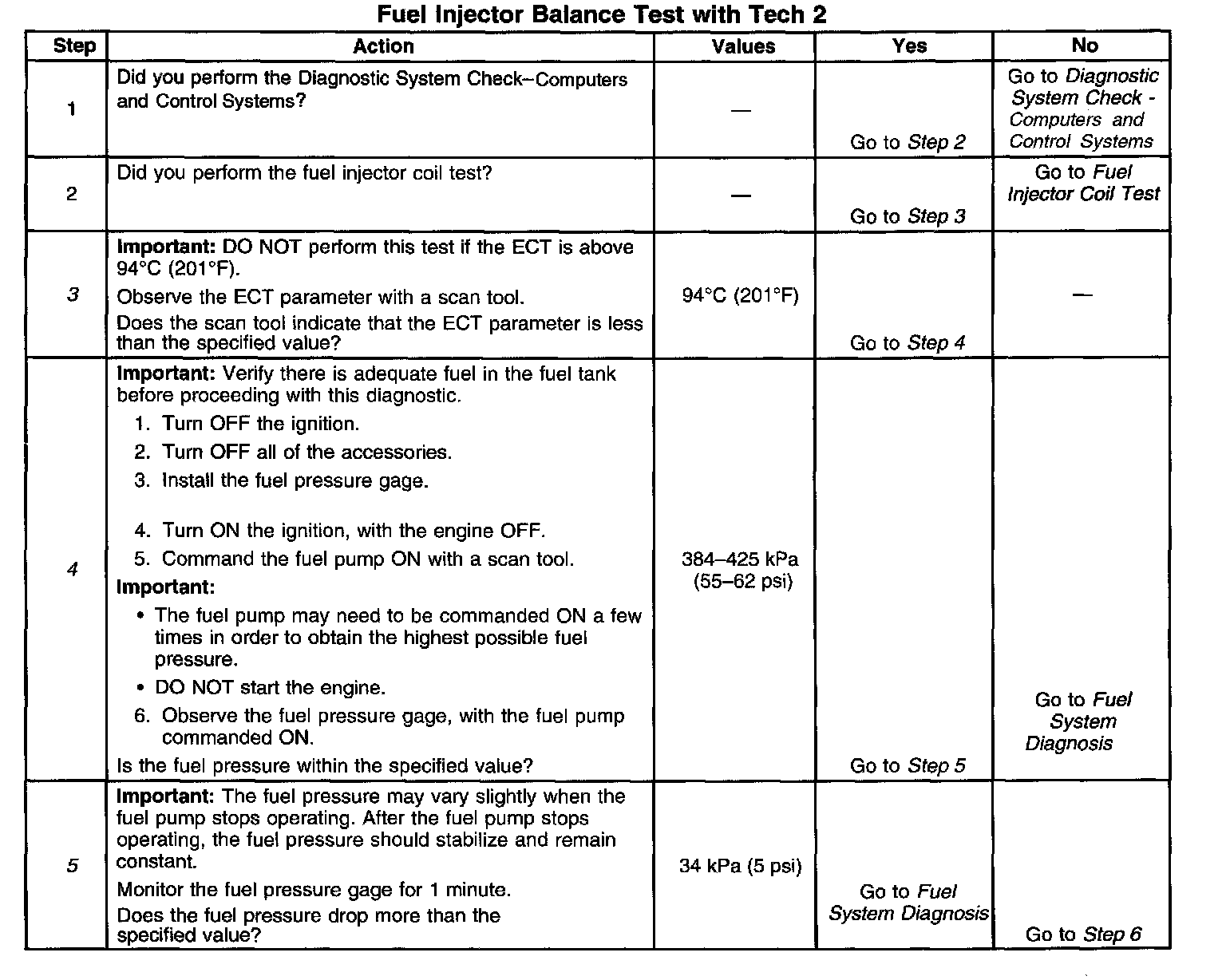 6. If the pressure drop value for each fuel injector is within 10 kPa (1.5 psi) of the average pressure drop value, the fuel injectors are flowing properly. Calculate the pressure drop value for each fuel injector by subtracting the second pressure reading from the first pressure reading.