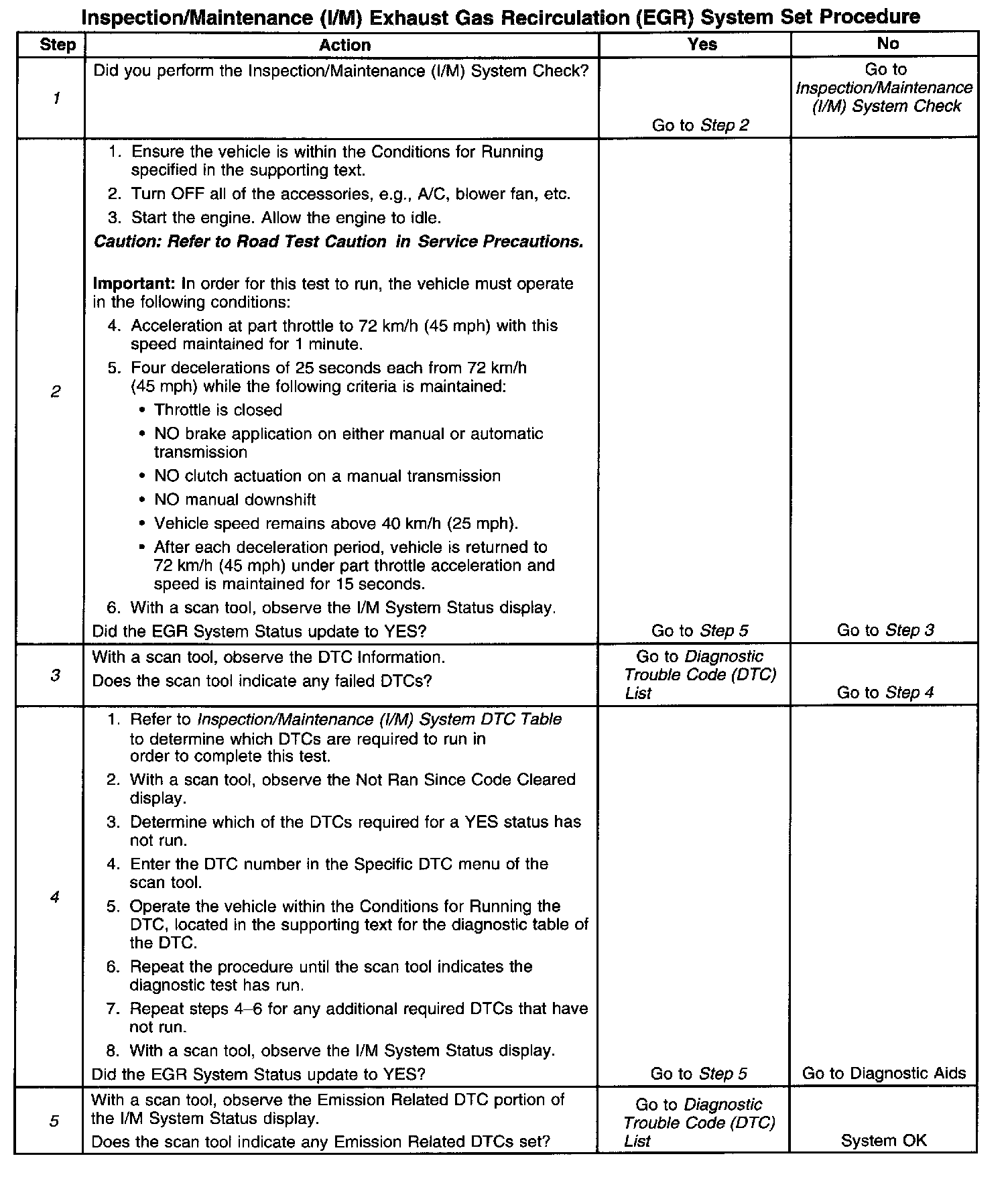 The control module only runs the EGR Active Tests during a gradual deceleration with a closed throttle and a vehicle speed above 40 km/h (25 mph). Several deceleration cycles may be necessary in order to accumulate a sufficient number of EGR flow samples. The procedure outlined in the table is for a clear, flat road. If the procedure is performed on a road with a slight down hill grade, the test may acquire the necessary sample counters in one or two decel trips. If the test is interrupted during the procedure, more than three deceleration cycles may be needed in order to complete the test. If the status does not update, the test outlined in this procedure can be repeated until the I/M System Status updates to YES.
