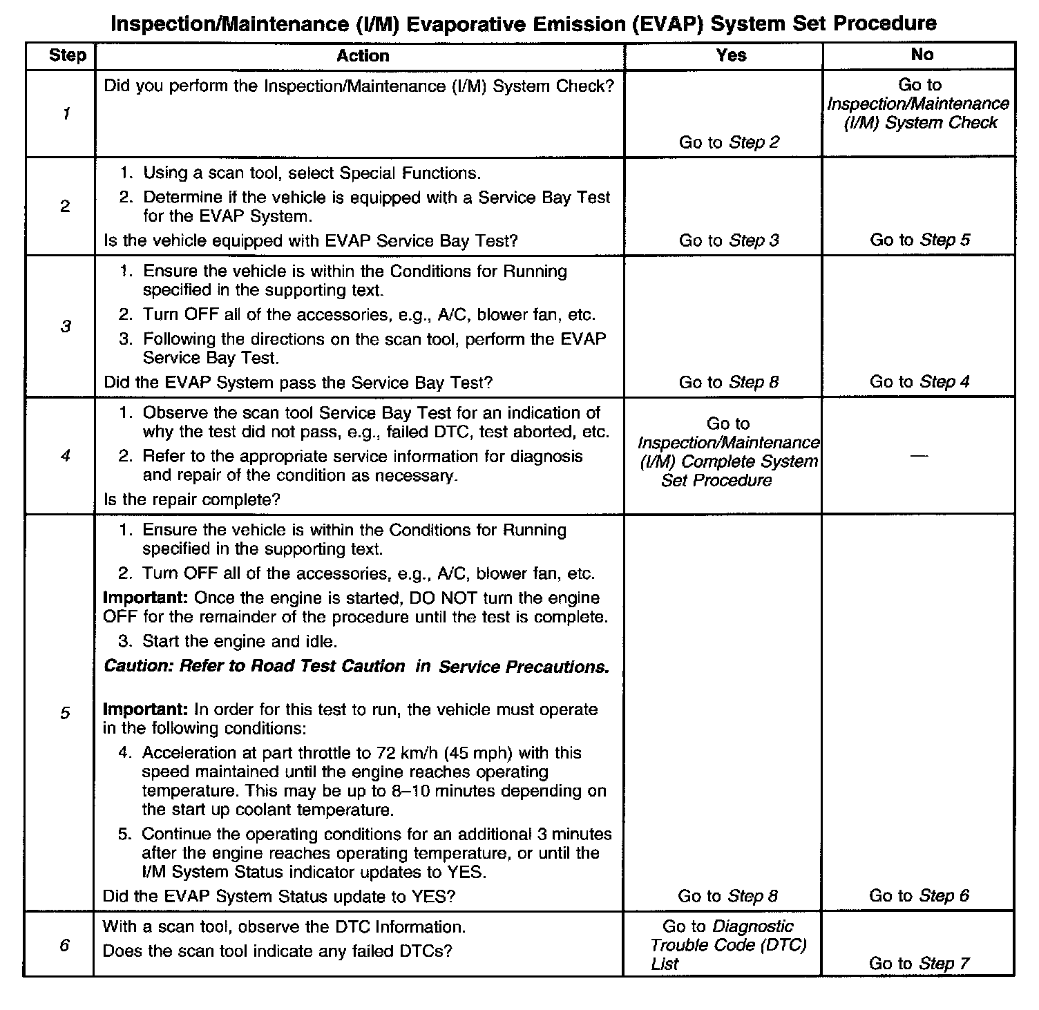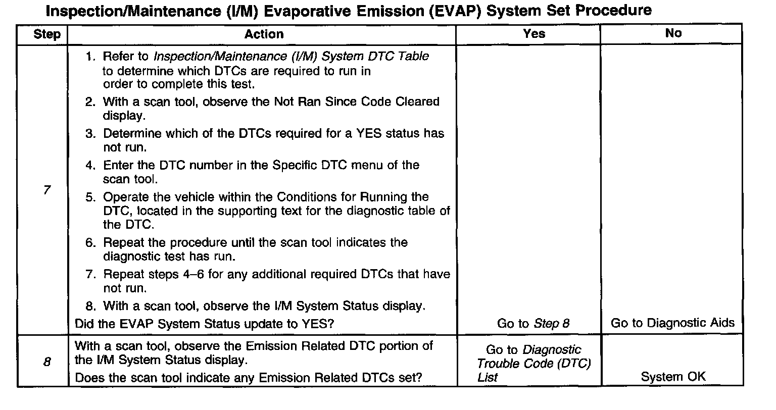 6. This step is to identify a first failure of a type B DTC. A DTC only appears on the I/M System Status display when the DTC becomes a MIL illuminating DTC. This occurs on the second failure of a type B DTC. A first failure of a type B DTC will not allow the I/M System Status to update to YES. Refer to Diagnostic Aids.
