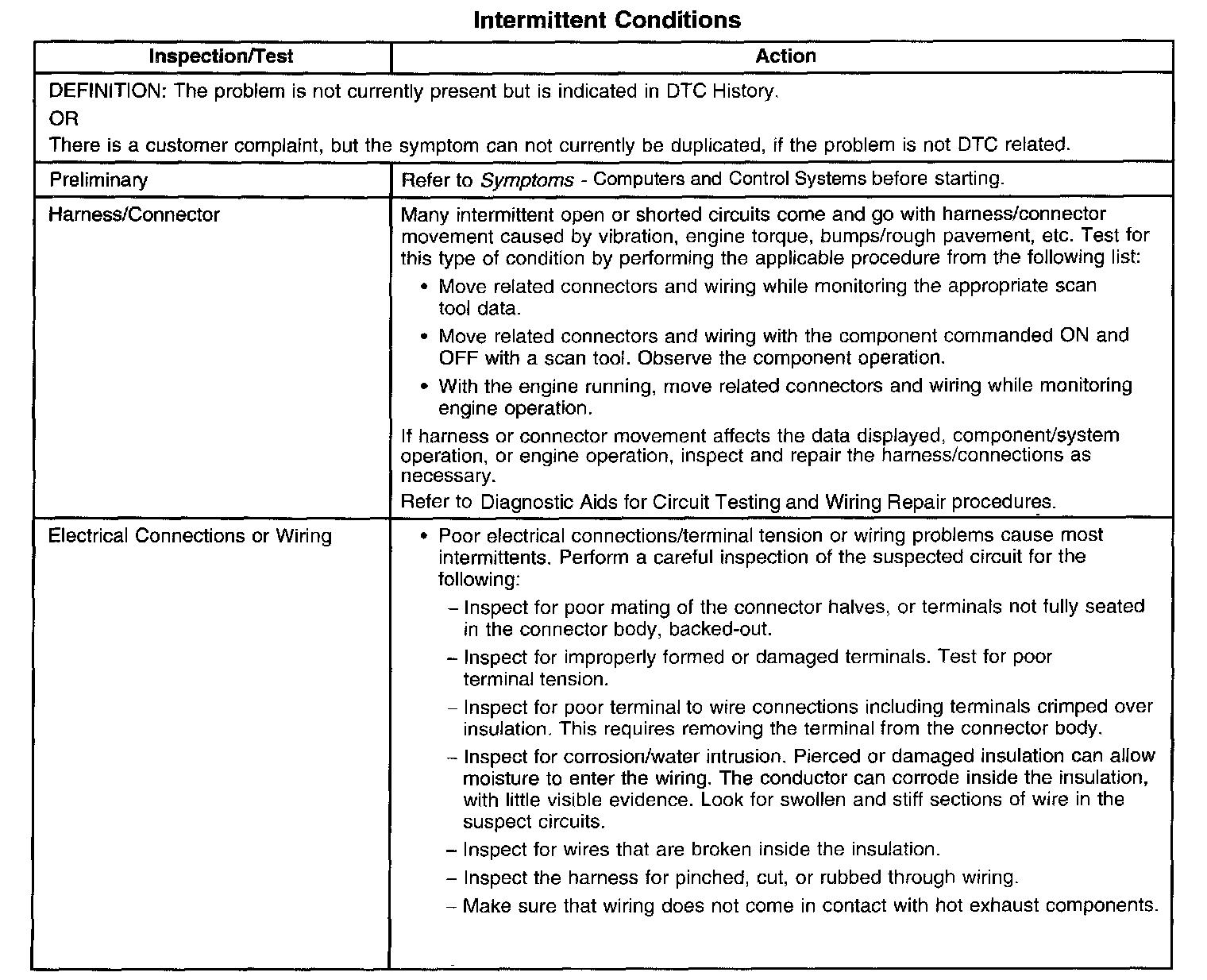 Faulty electrical connections or wiring cause most intermittent problems. Perform a careful visual and physical check for the following conditions: