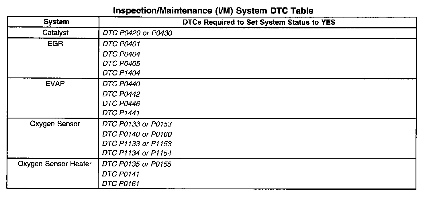Inspection/Maintenance (I/M) System DTC Table: