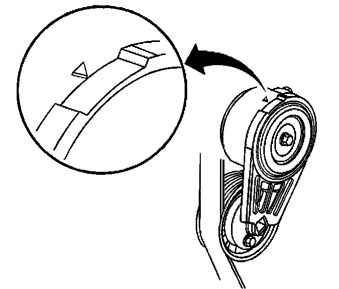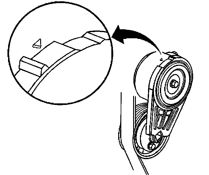10. Confirm for the proper drive belt size and the correct drive belt routing by observing the location of the fix pointer and the index marks on the drive belt tensioner. With a new drive belt Installed, the fix pointer should align within the indentation on the drive belt tensioner.