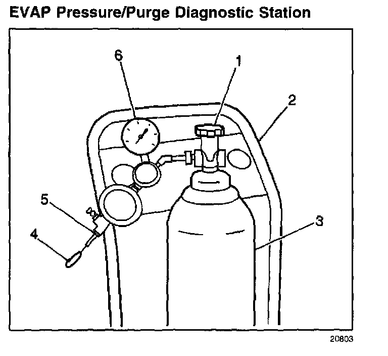 The J41413 EVAP Pressure/Purge Diagnostic Station (2) is used to help locate leaks in the EVAP system. The station provides a clean, dry, regulated supply of nitrogen to pressurize the EVAP system. Refer to the directions on the cart for proper operation. The fuel filler neck adapter is used to adapt the EVAP pressure/purge diagnostic station to the fuel filler neck. Pressurizing the EVAP system at the fuel filler neck allows testing of the filler neck and the fuel fill cap on vehicles with On-board Refueling Vapor Recovery (ORVR).