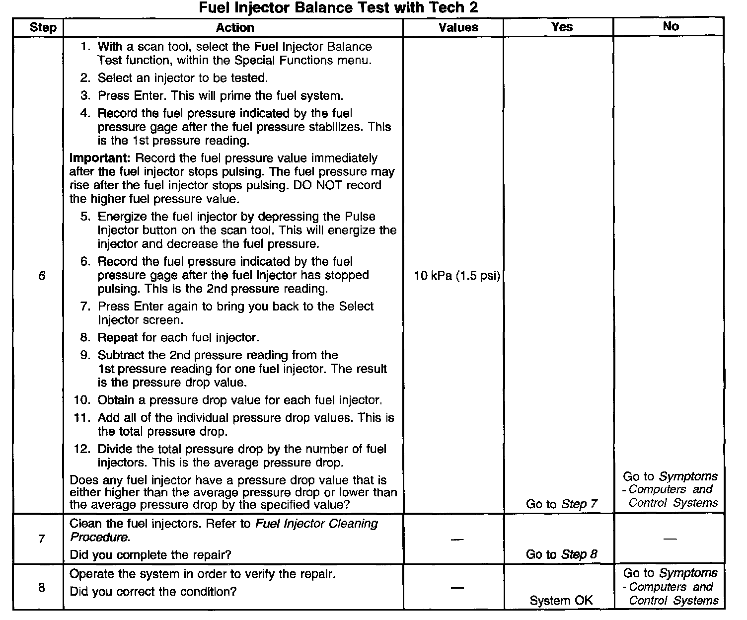 6. If the pressure drop value for each fuel injector is within 10 kPa (1.5 psi) of the average pressure drop value, the fuel injectors are flowing properly. Calculate the pressure drop value for each fuel injector by subtracting the second pressure reading from the first pressure reading.