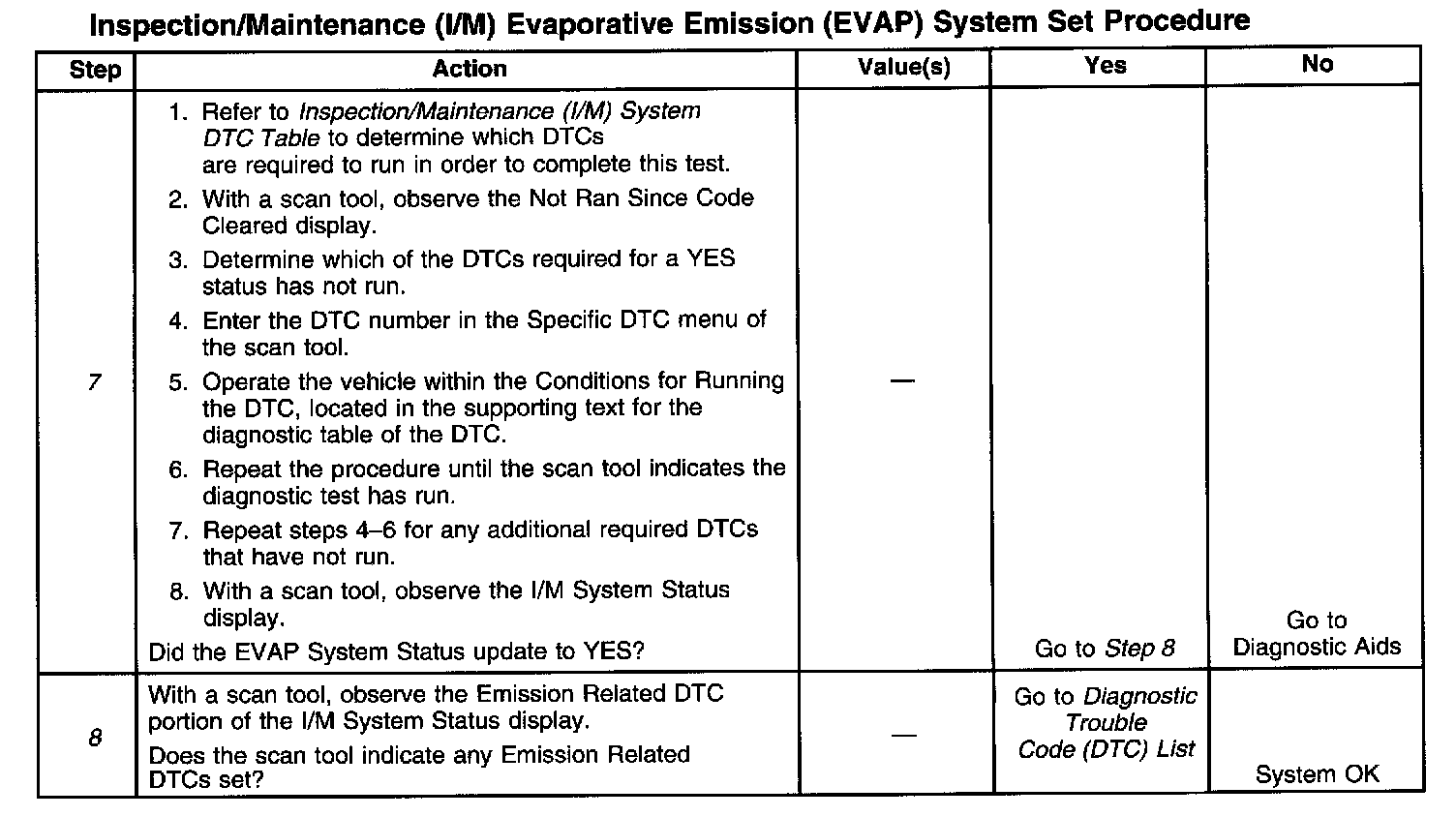 6. This step is to identify a first failure of a type B DTC. A DTC only appears on the I/M System Status display when the DTC becomes a MIL illuminating DTC. This occurs on the second failure of a type B DTC. A first failure of a type B DTC will not allow the I/M System Status to update to YES. Refer to Diagnostic Aids.
