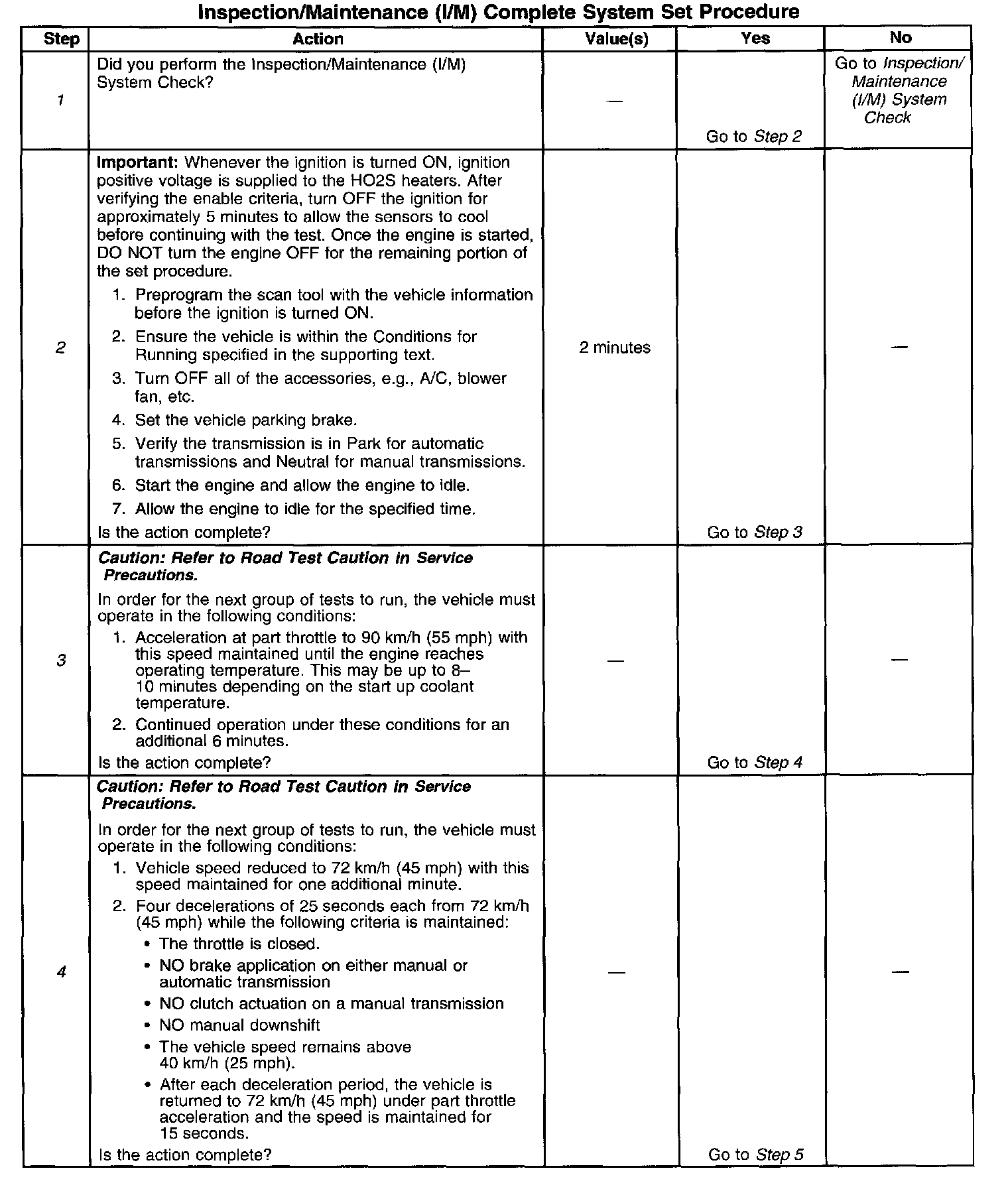 DESCRIPTIONThe purpose of the I/M Complete System Set Procedure is to satisfy the enable criteria necessary to execute all of the I/M readiness diagnostics, and complete the trips for those particular diagnostics. When all diagnostic tests are completed, the I/M System Status indicators are set to YES. Perform this test when more than one or all of the I/M System Status indicators are set to NO.