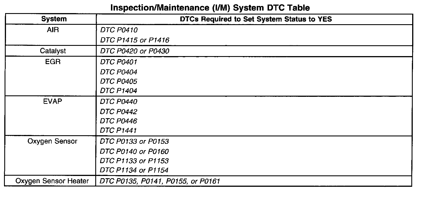 Inspection/Maintenance (I/M) System DTC Table: