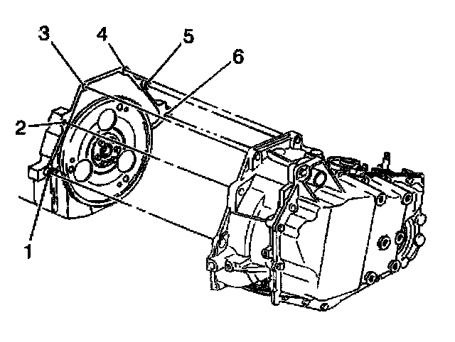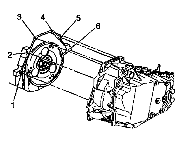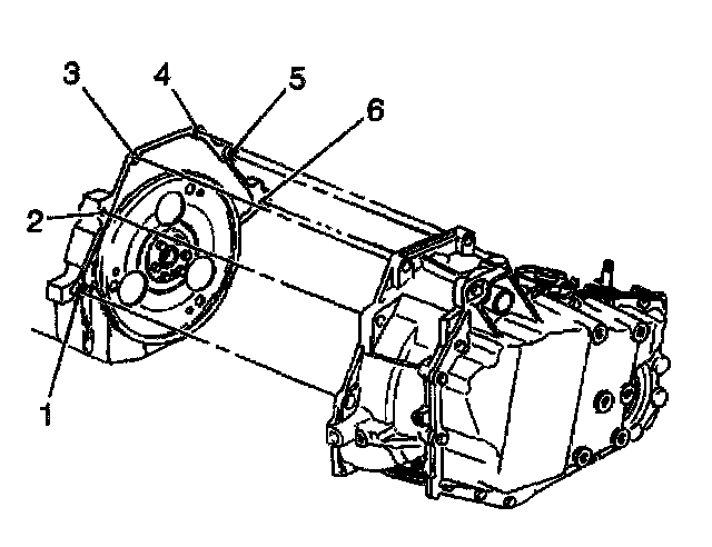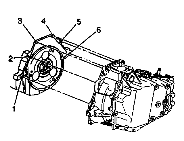 19. Remove the bolt (6) and the stud (1) which secure the lower transaxle to the engine.