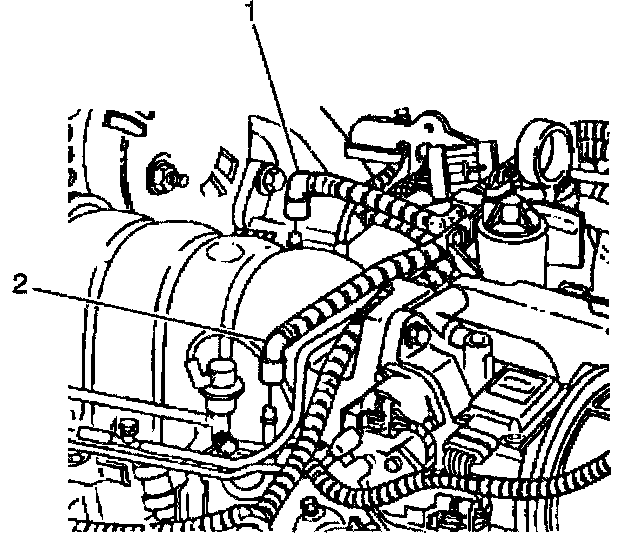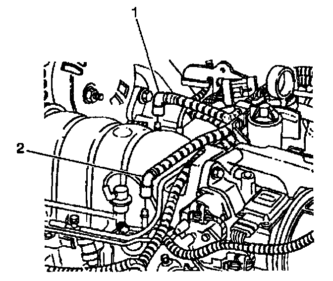 22. Disconnect the fuel lines (1,2) from the fuel rail. Lay the fuel lines aside.