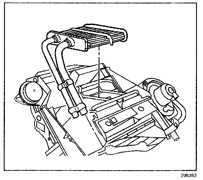 18. Remove the heater core line clamp screw (1) from the heater core.