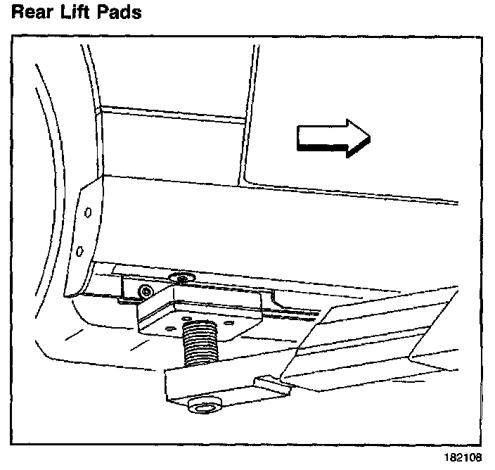 When lifting the vehicle with a frame-contact lift, place the rear lift pads at the rear pinchweld flanges.