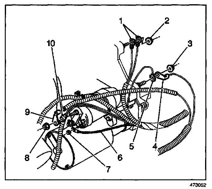 10. Remove the positive battery cable (9) from the starter motor BAT terminal.