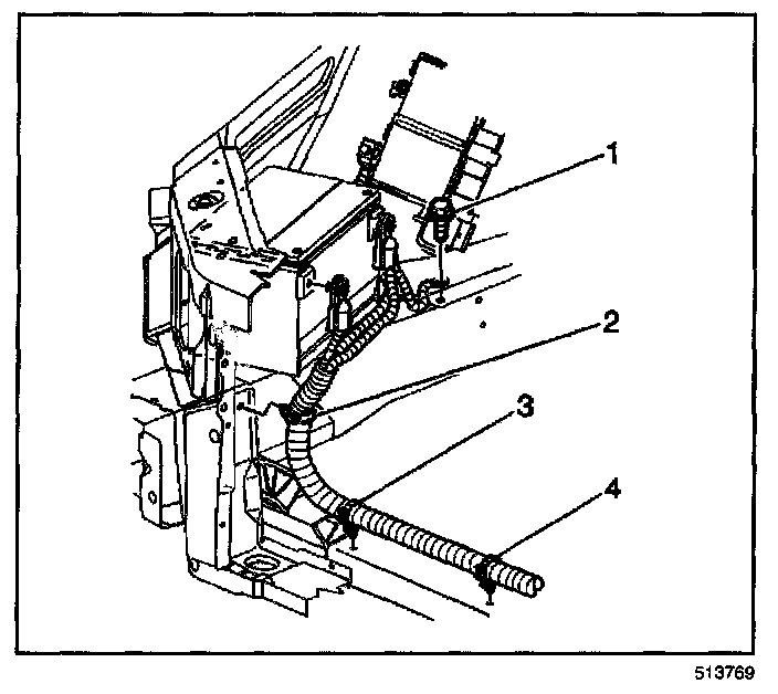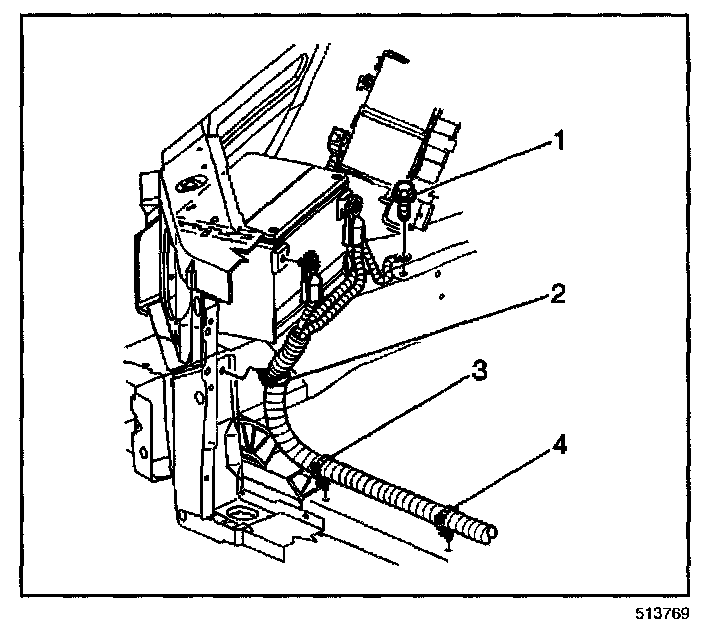 2. Install the battery cable harness to the retainers (2,3,4).