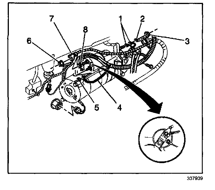 4. Install the positive battery cable (7) and install the solenoid BAT terminal nut (6) finger tight to the starter motor.