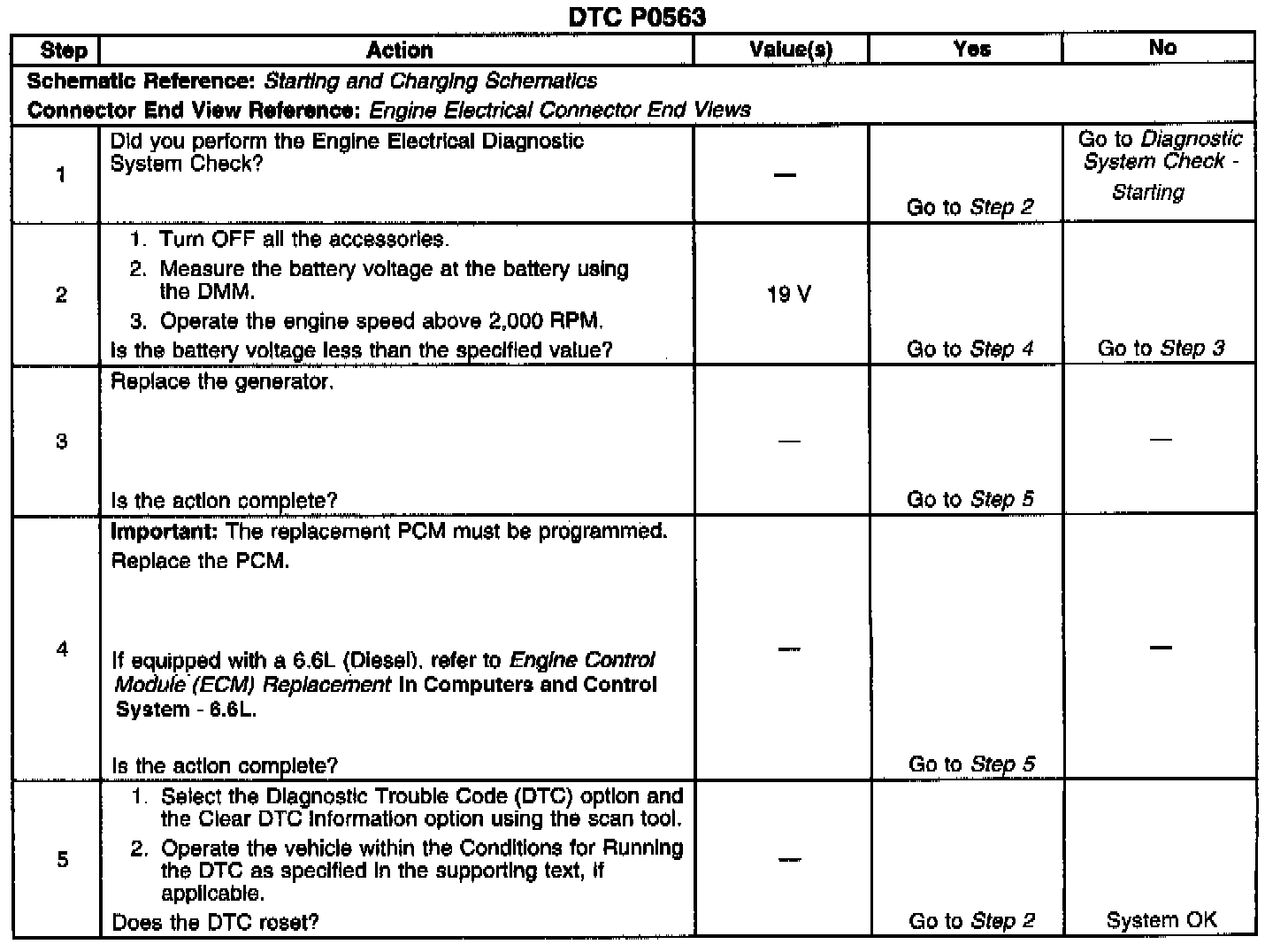 CIRCUIT DESCRIPTIONThe Powertrain Control Module (PCM) continuously monitors that the system voltage stays within the proper range. If the PCM detects an excessively high system voltage, DTC P0563 will set. A high voltage condition may cause a stalling condition or other driveability concerns.