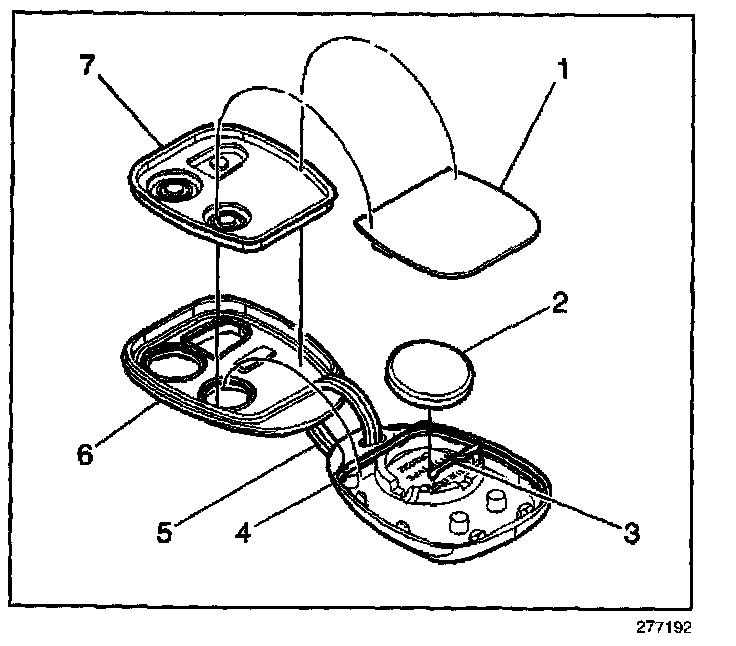 1. Insert a small bladed tool, or a small coin, at the slot provided near the key ring hole (5), between the two halves (6, 4) of the transmitter case.