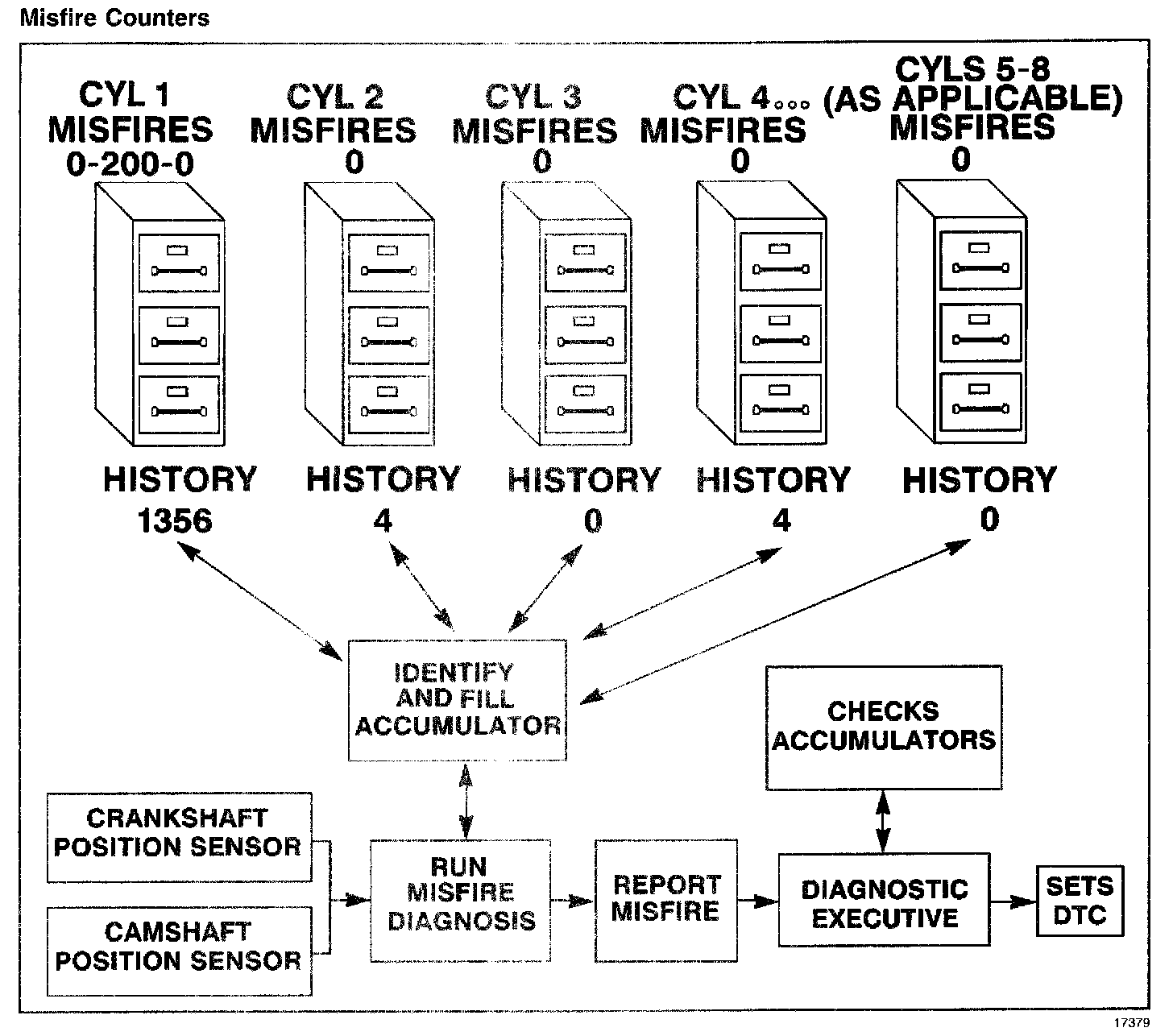 Whenever a cylinder misfires, the misfire diagnostic counts the misfires. Then the misfire diagnostic notes the CKP at the time the misfire occured These misfire counters are basically a file on each engine cylinder.