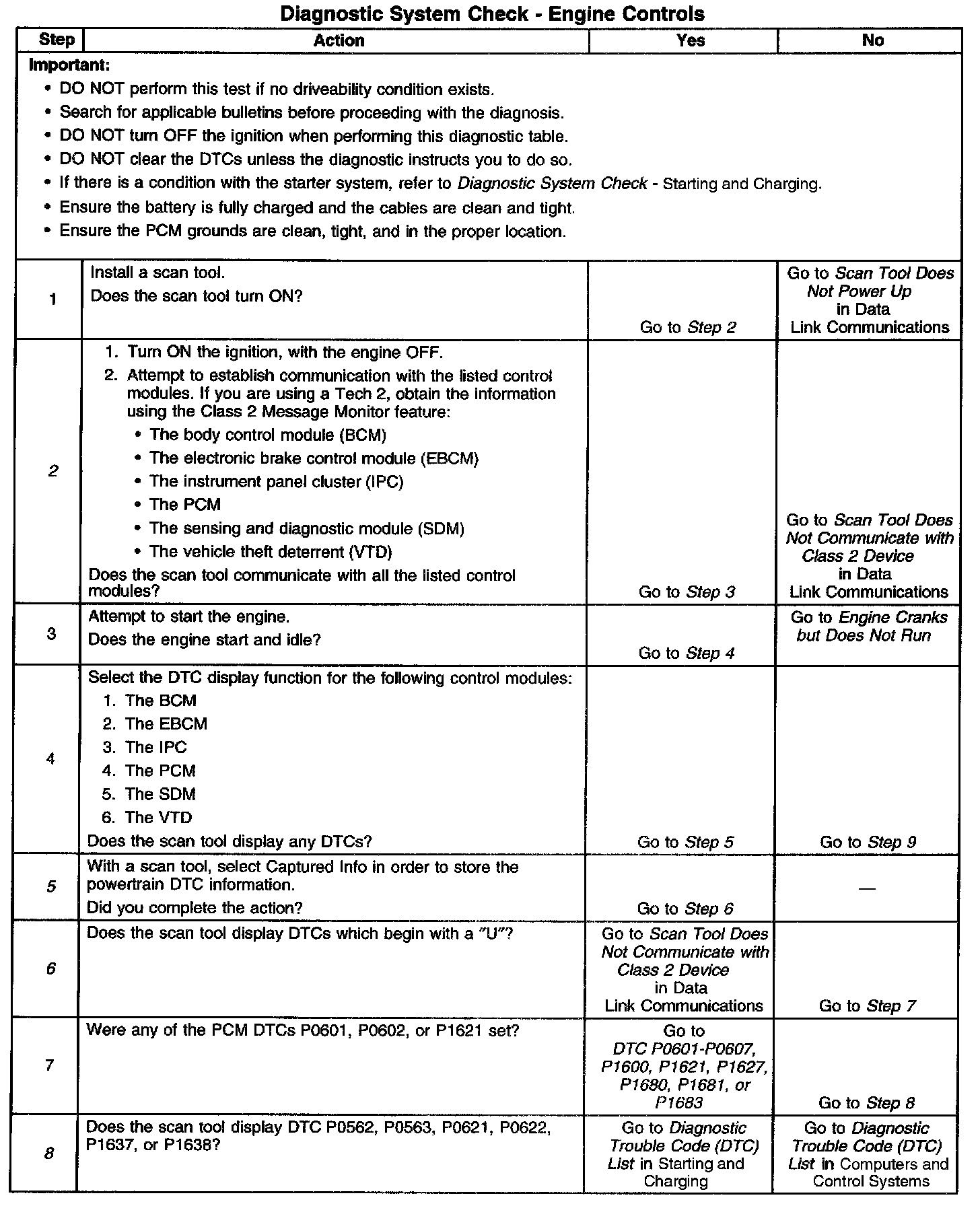DESCRIPTIONThe Diagnostic System Check-Computers and Controls Systems is an organized approach to identifying a condition that is created by a malfunction in the powertrain control system. The Diagnostic System Check must be the starting point for any driveability concern. The Diagnostic System Check directs the service technician to the next logical step in order to diagnose the concern. Understanding and correctly using the diagnostic table reduces diagnostic time, and prevents the replacement of good parts.
