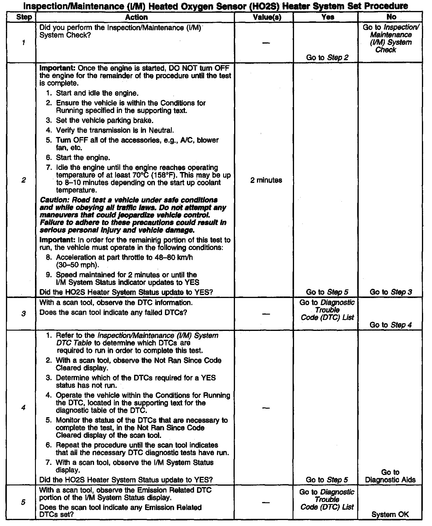 DESCRIPTIONThe purpose of this test is to satisfy the enable criteria necessary to execute I/M readiness diagnostics for the Heated Oxygen Sensor (HO2S) System. The test may be used to set the I/M System Status to YES. Ensure the vehicle meets the requirements listed in Conditions for Running before performing this test. Failure to meet the necessary requirements may produce inaccurate test results.