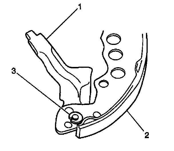 2. Remove the park brake shoe lever (1) and the retainer (3) from the brake shoe (2).