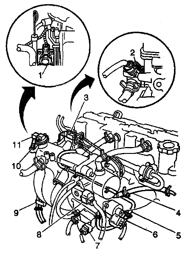 12. Remove the coolant hoses (4,5) from the throttle body and intake manifold.