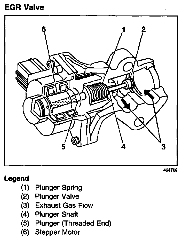 The EGR valve is a stepper motor design. A stepper motor (6) drives a worm gear, that is in mesh with a spring (1) loaded plunger (5). The valve (2) end of the plunger (4) controls the flow of exhaust gases (3). The plunger movement is controlled by the Powertrain Control Module (PCM). By turning the stepper motor in different directions, the PCM controls the opening of the exhaust gas passage to the intake manifold.