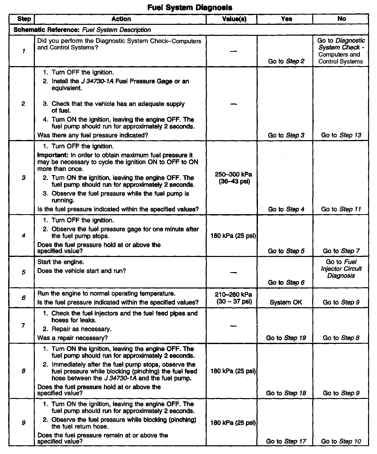 14. This step checks for additional conditions that can cause low fuel pressure other than a faulty fuel pump. Check for any restrictions or blockage in the fuel feed lines and hoses, including those inside the fuel tank. Check the fuel pump electrical circuit for excessive resistance. Proper fuel pump operation requires correct voltage and adequate current flow.