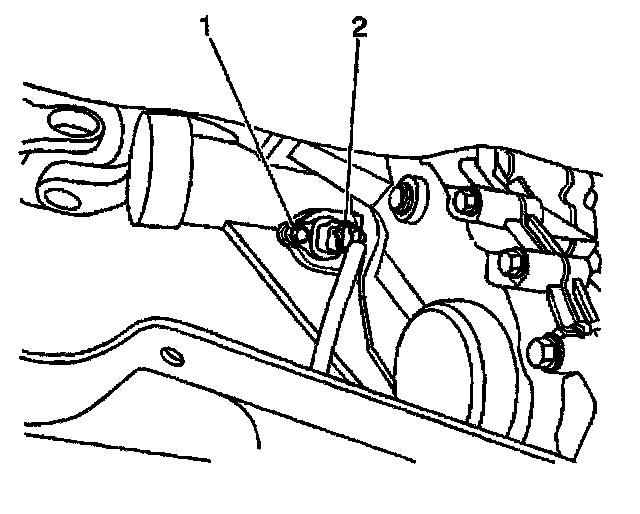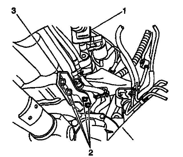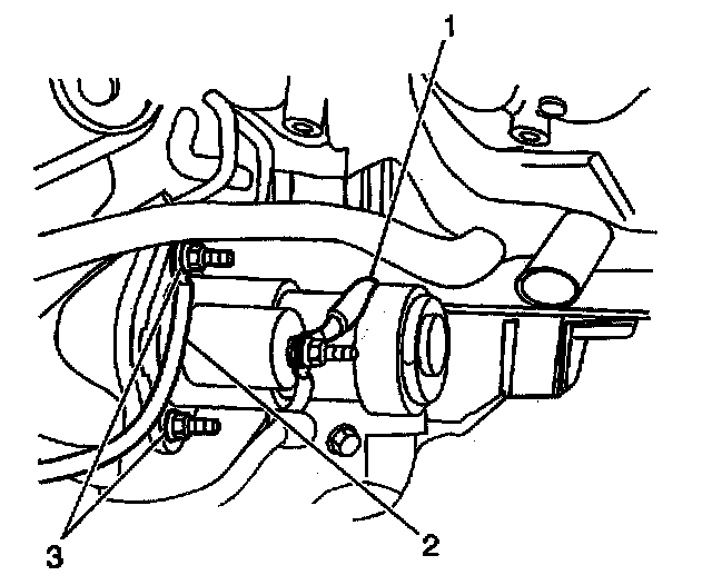 13. Install the engine brace (3) and the bolts (2) to the right side of the transmission.