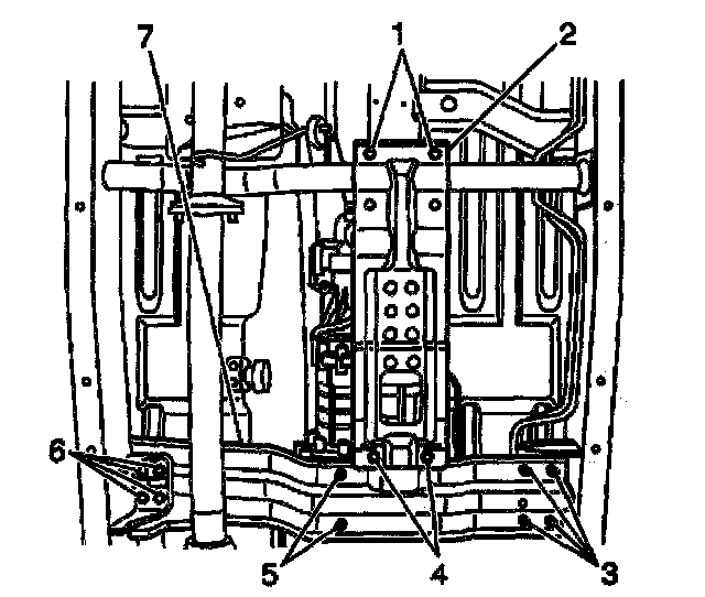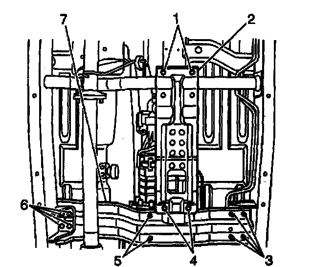 5. Install the crossmember (7) and the crossmember bolts (3, 5, 6).