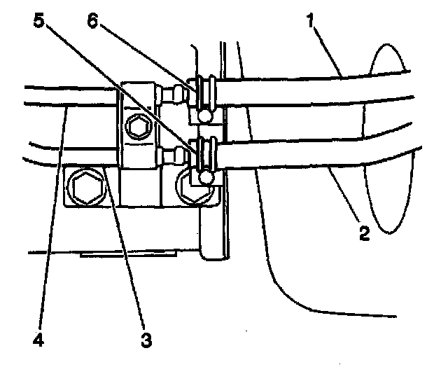 21. Remove the cooler hoses (1, 2) and the clamps (5, 6) from the transmission pipes (3, 4).
