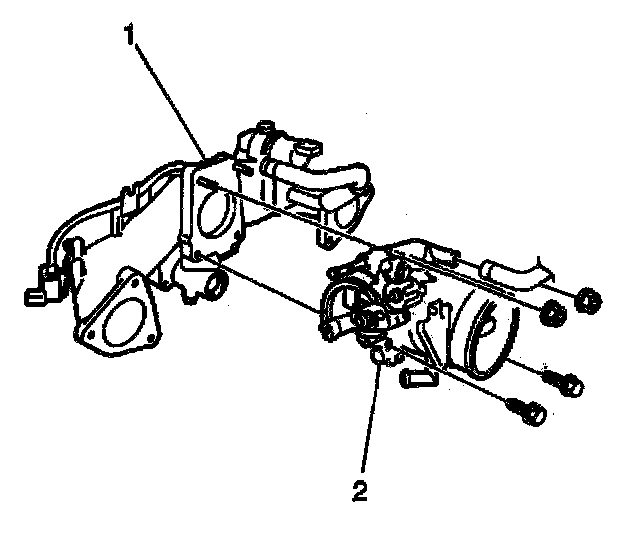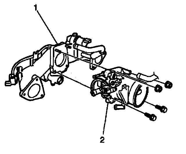 4. Install the throttle body (2) to the intake collector (1). Secure the throttle body with the 2 bolts and 2 nuts.