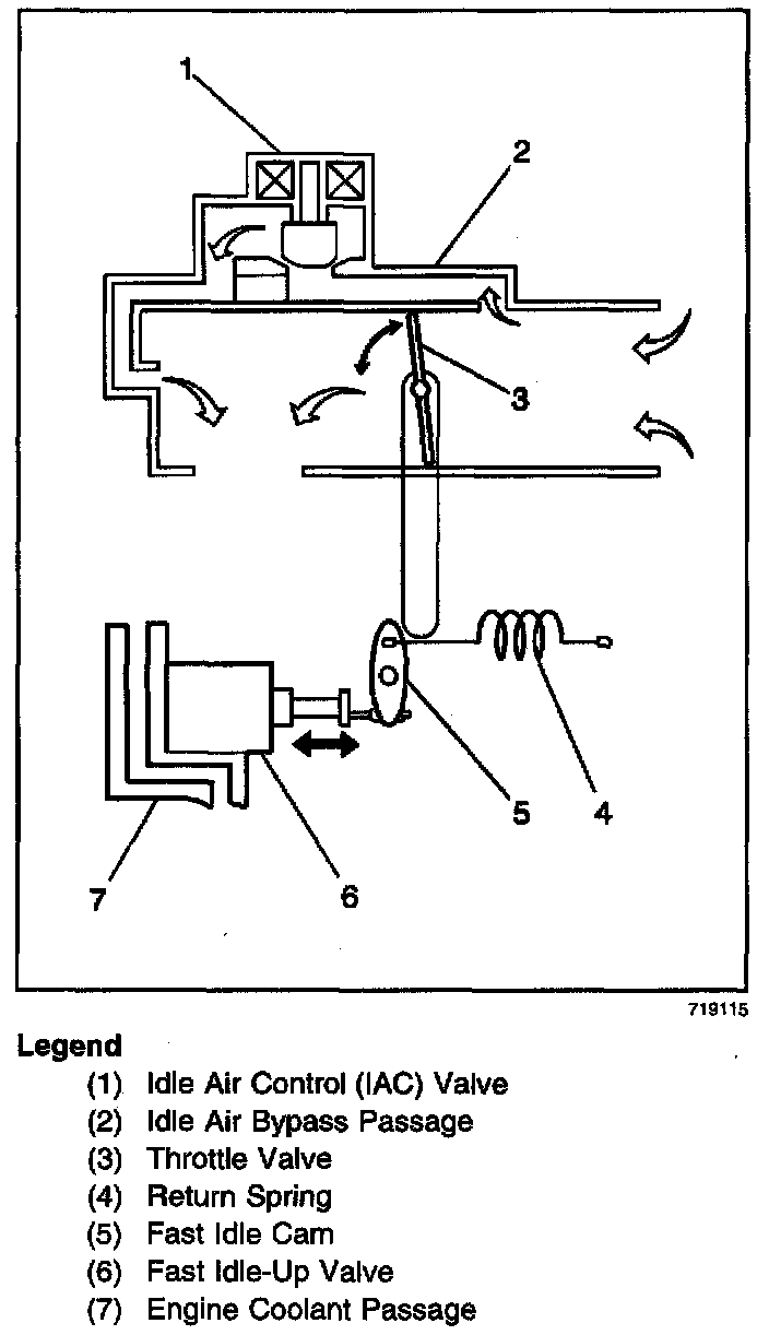 When the engine is cold, the fast idle-up valve (6) opens the throttle valve (3) slightly, increasing engine speed. The fast idle-up valve (6) contains a wax pellet that moves a plunger in response to engine coolant temperature (7). The fast idle-up plunger opens the throttle valve by pushing the fast idle cam (5).