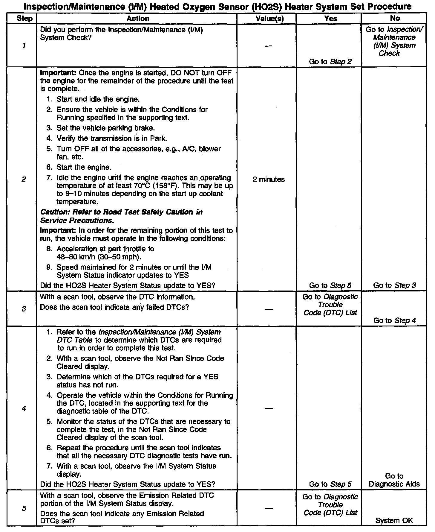 DESCRIPTIONThe purpose of this test is to satisfy the enable criteria necessary to execute I/M readiness diagnostics for the Heated Oxygen Sensor (HO2S) System. The test may be used to set the I/M System Status to YES. Ensure the vehicle meets the requirements listed in Conditions for Running before performing this test. Failure to meet the necessary requirements may produce inaccurate test results.