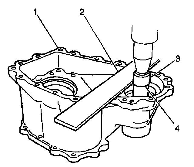 21. Using a press and J 37753, press-fit the needle bearing into the center case (1). Apply a straightedge (2) to the top surface of the case and press-fit until the limit line (4) of J 37753 aligns with the bottom surface of the straightedge.