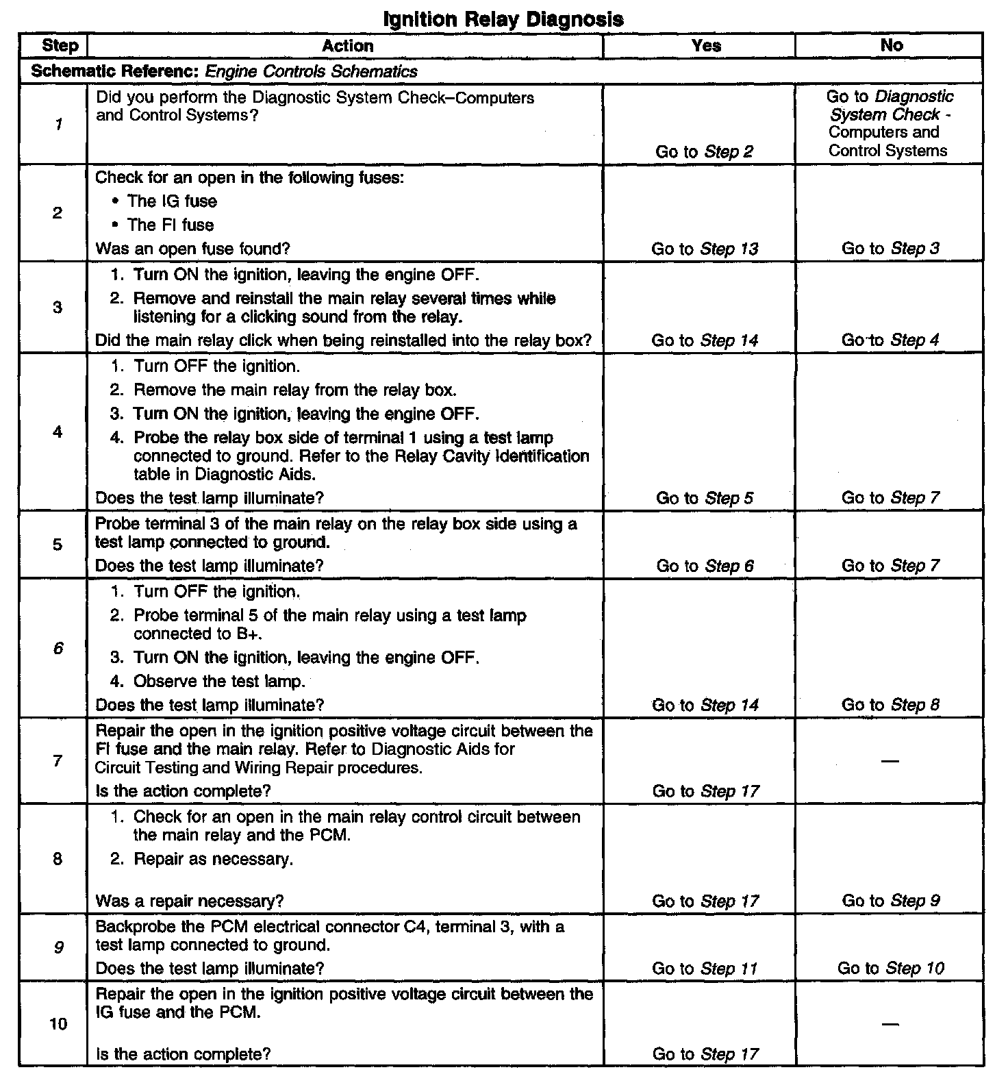 9. This step checks for ignition positive voltage at the PCM. The PCM will not operate the main relay if there is no power to terminal 20.