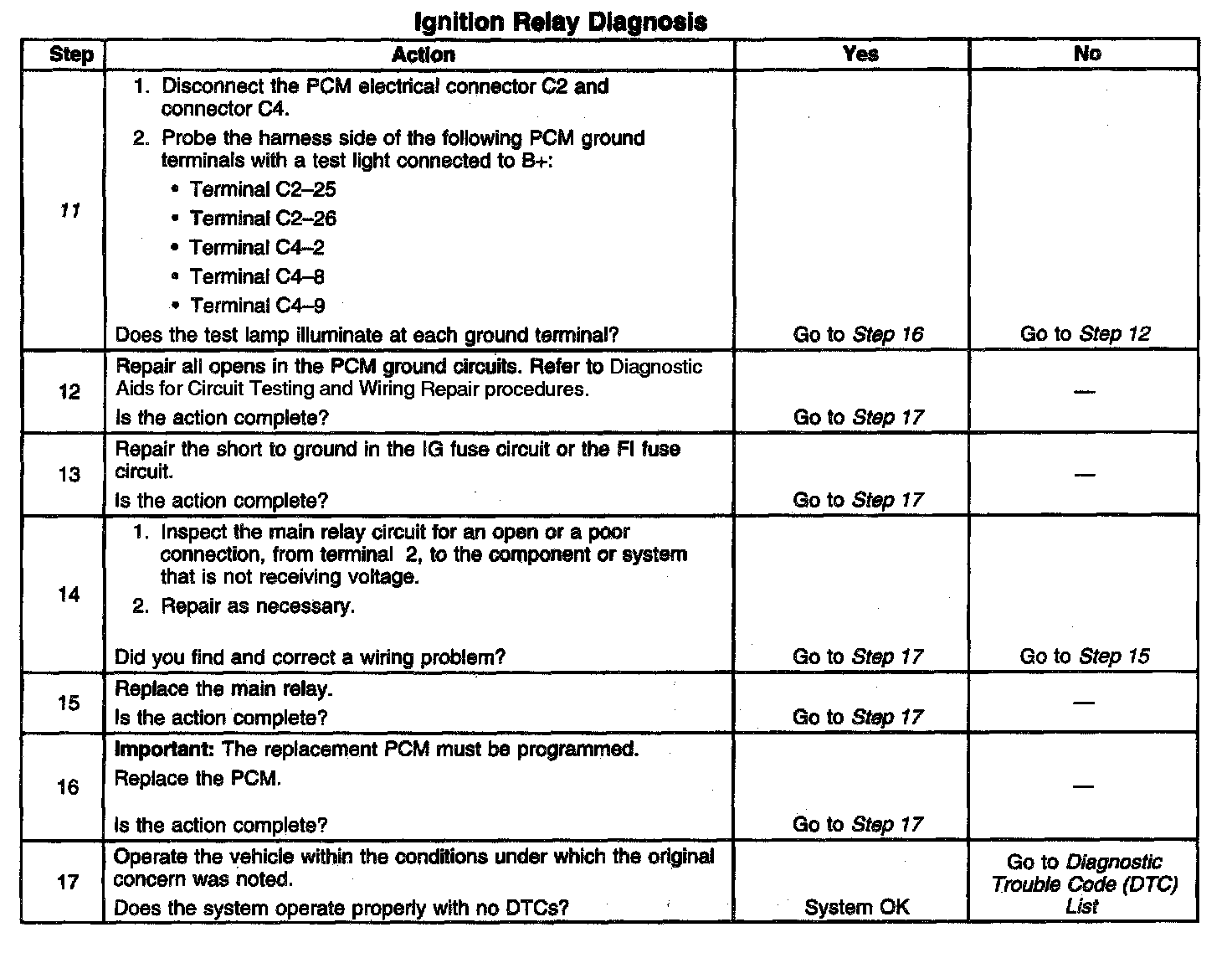 11. This step checks for an open in the PCM electrical grounds. The PCM will not operate the main relay if there are no electrical grounds.